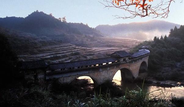 玉帶橋:因其弧形如玉帶,故名。玉帶橋為當(dāng)?shù)馗晃逃囡L(fēng)歧募資建于清乾隆五年(公元1740年),又名“風(fēng)歧橋”。玉帶橋為二墩三孔屋樓式拱橋,橋身成弧行,橋長88.15米,是江南現(xiàn)存最長的弧形廊橋,它以結(jié)構(gòu)獨特,氣勢雄偉而聞名贛粵。留下了“遠近聞名玉帶橋,兩岸峻峰入云霄。奔騰河水瀉千里,玉帶飛鎮(zhèn)兩山腰”的贊譽。