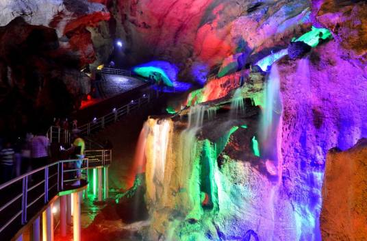 洞內(nèi)常年恒溫18度冬暖夏涼。洞內(nèi)景點多達一百余個,如:天堂大廳、童子拜觀音、千丘梯田、倒柳垂楊、許愿池、回龍廳等。最為壯觀的是洞內(nèi)的洞天飛瀑,它高九米寬七米,天然瀑布水從九米高的上空直奔洞池,濺起無數(shù)水花,聲勢浩大聲撼震天,為此洞一絕。清風、怪石、流泉、飛瀑被稱為“洞中四絕”。