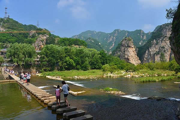 指的是流經(jīng)冰峪的兩條河:英納河和英納河的支流小峪河,此處是兩條河的交匯點(diǎn),水中立的巨石叫“劍劈石”,劍石周?chē)乃蚪小霸聞μ丁薄?/p>