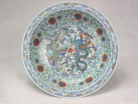 清雍正款斗彩龍鳳大盤:此盤為白地斗彩大盤,盤內(nèi)飾斗彩龍鳳戲珠紋,一條行云五爪飛龍,龍身蜿蜒矯健,鳳舞展翅穿于祥云之間,呈龍飛鳳舞圖案。盤外飾海水江崖,壽山福海。壽山上靈芝盛開,云蝠翩翩。底“大清雍正年制”六字兩行雙圈青花楷書書款。整個大盤胎質(zhì)細膩,釉色純正,造型規(guī)矩,為清宮祝壽時的御用器皿。