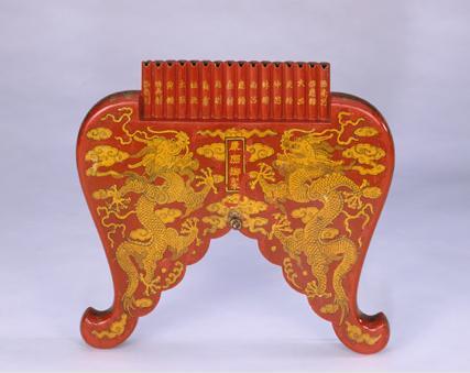 清乾隆款朱漆描金云龍紋排簫:通體遍涂朱紅彩漆,大部分為木制,刻成獸腿開叉形狀,腿下部雕成云頭形狀。雙面均描金繪二龍戲珠、浮云、火焰圖案,在正面火焰珠位置為長條方池,內(nèi)有金漆楷書“乾隆八年制”年款。排簫上部為單排十六根竹管,用于吹奏之用,管上正面各以金漆書寫楷書律名,從左至右依序為“倍夷則”“倍無射”“黃鐘”“太簇”“姑洗”“蕤賓”“夷則”“無射”“應(yīng)鐘”“南呂”“林鐘”“仲呂”“夾鐘”“大呂”“倍應(yīng)鐘”“倍南呂”。排簫底部系有一條五彩流蘇。