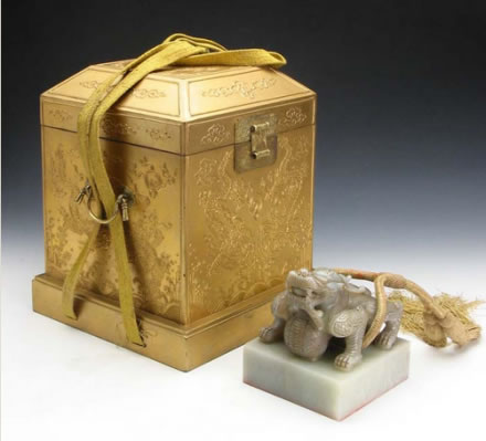 清世宗憲皇帝謚寶:此寶為嘉慶四年(1799)清宮內(nèi)府遵旨由舊寶改鐫而成。寶上部為單體蹲龍紐,描金,紐上系明黃絲繩。謚寶文字為滿、漢文合璧,均為朱文,右側(cè)為漢文篆書四行,左側(cè)為滿文篆書四行。其文為“世宗敬天昌運建中表正文武英明寬仁信毅睿圣大孝至誠憲皇帝之寶”。謚寶外包明黃織金四則團花暗云紋錦包袱皮,用雙層龍鳳紋金漆套盒盛裝。該寶于嘉慶四年改鐫后由北京送至盛京太廟尊藏,清末民國時期存于沈陽故宮崇謨閣內(nèi)。