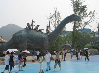 侏羅紀(jì)激流探險,總占地面積8600平方米,以一種時空穿插的景觀設(shè)計手法,將五種八只侏羅紀(jì)時期的恐龍置身于虛幻的遠古村落中。載客古船,沿210米長,15米高的水道激流急下,沿途中,一只高9米,長19.8米,重約8噸的亞洲最大的機械恐龍“巨無霸”,不時的向沖刺在激流中的游人搖頭擺尾,吼叫或噴水,載客古船激起的25米高的巨浪。 旅游船