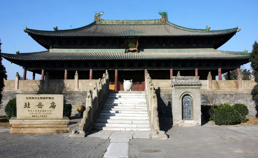 北岳廟,漢稱北岳祠,唐稱北岳安天王廟,宋稱北岳安天元圣帝廟,元稱北岳安天大貞元圣帝廟,到明時去掉歷代所加封號,改稱為北岳廟,坐落在河北省保定市曲陽縣城西部恒州鎮(zhèn)北岳路2號,始建于南北朝時期北魏景明、正始年間(500—512年),清順治十七年(1660年)以前,北岳廟一直是歷代封建帝王祭祀北岳恒山之神的場所,總占地面積為173982平方米。北岳廟建筑格局呈坐北朝南的“田”字形,采用的是以中軸線為主,兩廂對稱的傳統(tǒng)建筑形式。廟內(nèi)主體建筑德寧之殿在中軸線北端,往南依次建有飛石殿、三山門、凌霄門、御香亭、朝岳門、牌坊、石橋等。北岳廟是一座內(nèi)涵豐厚的文化藝術(shù)殿堂,集古建、繪畫、書法、石雕、定瓷等藝術(shù)于一身。北岳廟碑刻對研究所處時代的政治、經(jīng)濟、文化以及書法藝術(shù)的演變,提供了珍貴的實物資料。