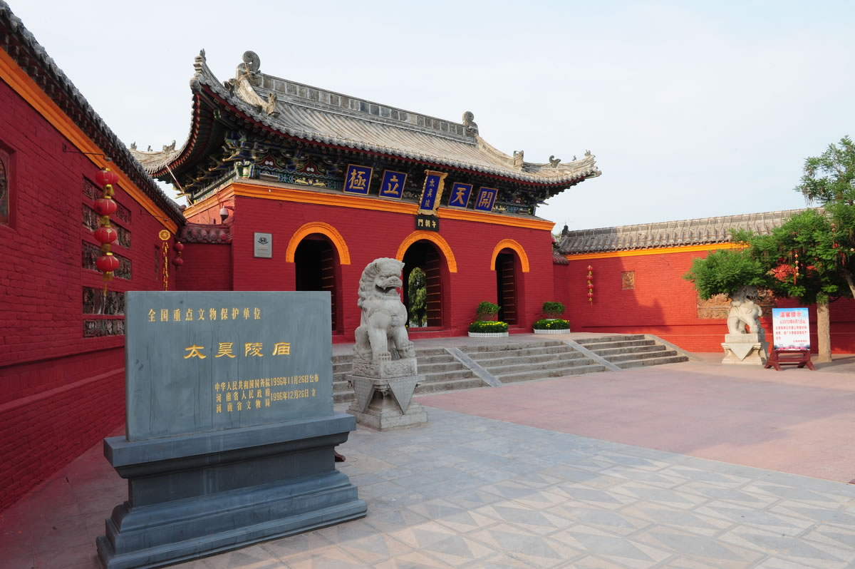 太昊陵廟,位于河南省周口市淮陽區(qū)中華太昊伏羲始祖圣地旅游區(qū)內(nèi),始建于明正統(tǒng)年間,是為紀(jì)念三皇之首太昊伏羲氏而修建的陵廟合一的大型古建筑群,是中國十八大名陵之一。太昊陵廟占地面積875畝,南北長750米,分外城、內(nèi)城、紫禁城三道皇城。從南至北的中軸線上依次為渡善橋、午朝門、道儀門、先天門、太極門、統(tǒng)天殿、顯仁殿、太始門、八卦壇、太昊陵墓、蓍草園。太昊陵廟以先天八卦數(shù)理興建,是中國帝王陵廟中大規(guī)模宮殿式古建筑群之孤例。