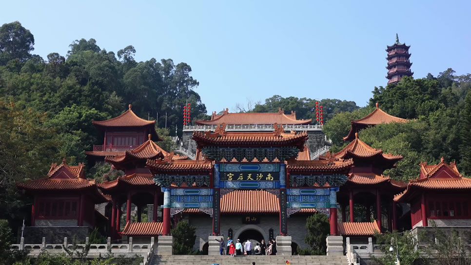 廣州南沙天后宮,又叫“媽祖廟”,位于廣東省廣州市南沙區(qū)天后路88號,坐落于大角山東南麓,地處粵港澳大灣區(qū)之心,瀕臨珠江出?诘牧尕暄螅嫉孛娣e達18萬平方米。廣州南沙天后宮前身是明代建于鹿頸村的天妃古廟,清乾隆年間經(jīng)重修定名為元君古廟,抗戰(zhàn)時期被日寇飛機炸毀,而后于1994年重建。廣州南沙天后宮是為紀念海上女神林默而建,是一個以媽祖文化為主題的景區(qū),是粵港澳大灣區(qū)媽祖文化交流中心,亦是東南亞最大之媽祖廟。廣州南沙天后宮采用清式建筑對稱布局,高低錯落地依山而建,建筑的特點集北京故宮的風格和南京中山陵的氣勢于一體,規(guī)模為現(xiàn)今世界同類建筑之最。廣州南沙天后宮由廣場、宮殿和南嶺塔三部分構成,“天后八景”包括:濱海銀灘朝陽、五彩靈徑、媽祖靈釵、“南沙人”遺址、靈宮賜福、南嶺夕照、抗戰(zhàn)神炮、默娘之家八個景點。