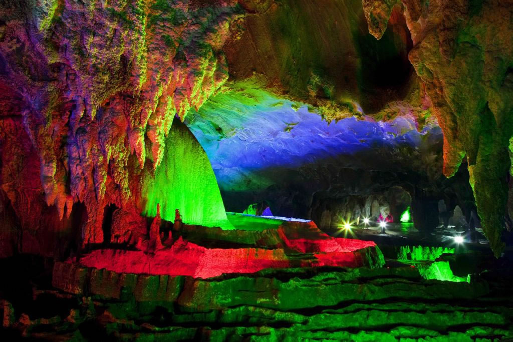 - 特色:兩億多年地殼變化形成,分四層,已開放三層,總面積3萬平方米,游程1.5公里。洞內(nèi)石筍、石柱、石幔千姿百態(tài),有“龍骨塔”等大型景觀,摩崖石刻群(關(guān)山月題寫“寶晶宮”)。