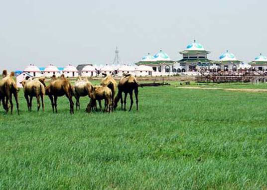 旅游區(qū)占地6000畝,總建筑面積為3260平方米,整體設計突出民族特色;五個殿堂式迎賓包,坐落在1.3米高的平臺上,氣勢磅礴,造型典雅,富麗堂皇,兩側是18個豪華型固定包和14個傳統(tǒng)氈包,組成蒙古包群。建筑的正南面是周長為1000米的賽馬場,通遼市一年一度的賽馬節(jié)就在這里舉行。