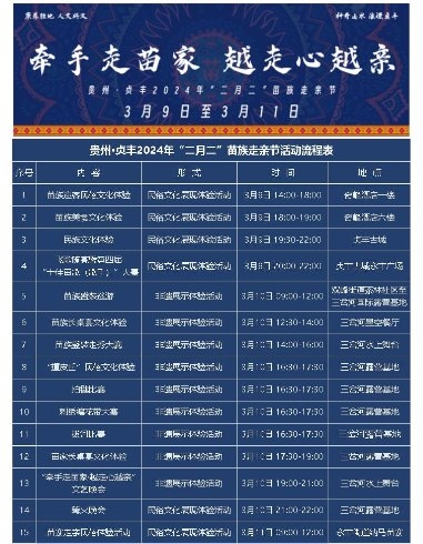 活動以“牽手走苗家·越走心越親”為主題,將在貞豐古城、三岔河、雙乳峰、納馬苗寨等地舉辦特色迎賓、盛裝走秀、民俗走親及巡游活動、刺繡編花帶比賽、“撞皮秋”民俗體驗、拔河比賽、篝火晚會等豐富多彩的活動。