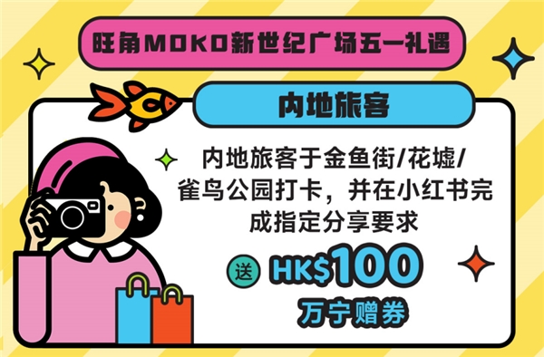 針對(duì)游客需求的變化,香港政府推出相關(guān)扶持政策,以支持區(qū)域特色打卡發(fā)展。以香港最著名的旅游區(qū)、購(gòu)物區(qū)和美食區(qū)旺角為例,為了迎接內(nèi)地游客,香港政府在金魚街、花墟、雀仔公園設(shè)置不同打卡裝置。當(dāng)?shù)氐纳虉?chǎng)也通過(guò)各種舉措歡迎內(nèi)地游客。旺角地標(biāo)MOKO新世紀(jì)廣場(chǎng)面向內(nèi)地游客推出專享優(yōu)惠“日夜打卡繽紛禮”,于以上景點(diǎn)打卡分享到小紅書社交媒體及完成指定要求,可免費(fèi)領(lǐng)取總值100港幣的萬(wàn)寧贈(zèng)券一份,一鍵PO出雙倍快樂(lè)。