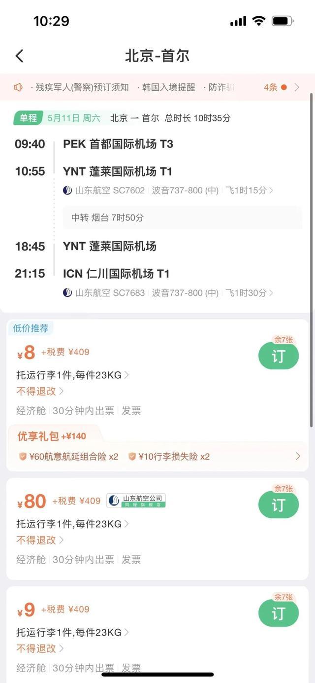 國際機(jī)票方面,中新經(jīng)緯查詢發(fā)現(xiàn),5月11日北京飛往首爾的機(jī)票(不含稅)價(jià)格低至8元,但另需409元稅費(fèi)。具體來看,該航班5月11日早9點(diǎn)40分從北京首都機(jī)場(chǎng)起飛,經(jīng)煙臺(tái)蓬萊國際機(jī)場(chǎng)轉(zhuǎn)機(jī),于當(dāng)天晚上9點(diǎn)15分落地仁川國際機(jī)場(chǎng)。