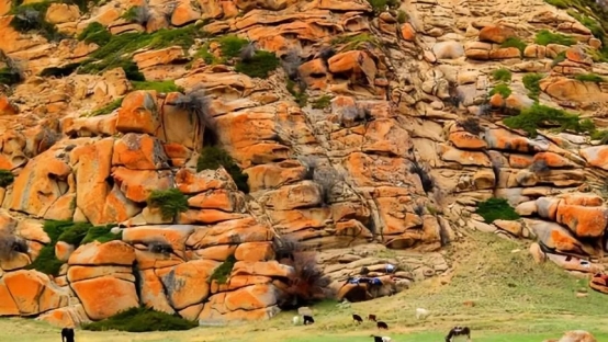 6.伊吾紅石峪(伊吾前山鄉(xiāng)北部山地中,背風(fēng)坡的山地草原,有一片罕見的花崗巖山體,被凜冽的北風(fēng)風(fēng)化成丘陵狀,巨大的花崗巖則破碎成一個個的小塊,花崗巖破碎成類似于黃山飛來石的感覺。