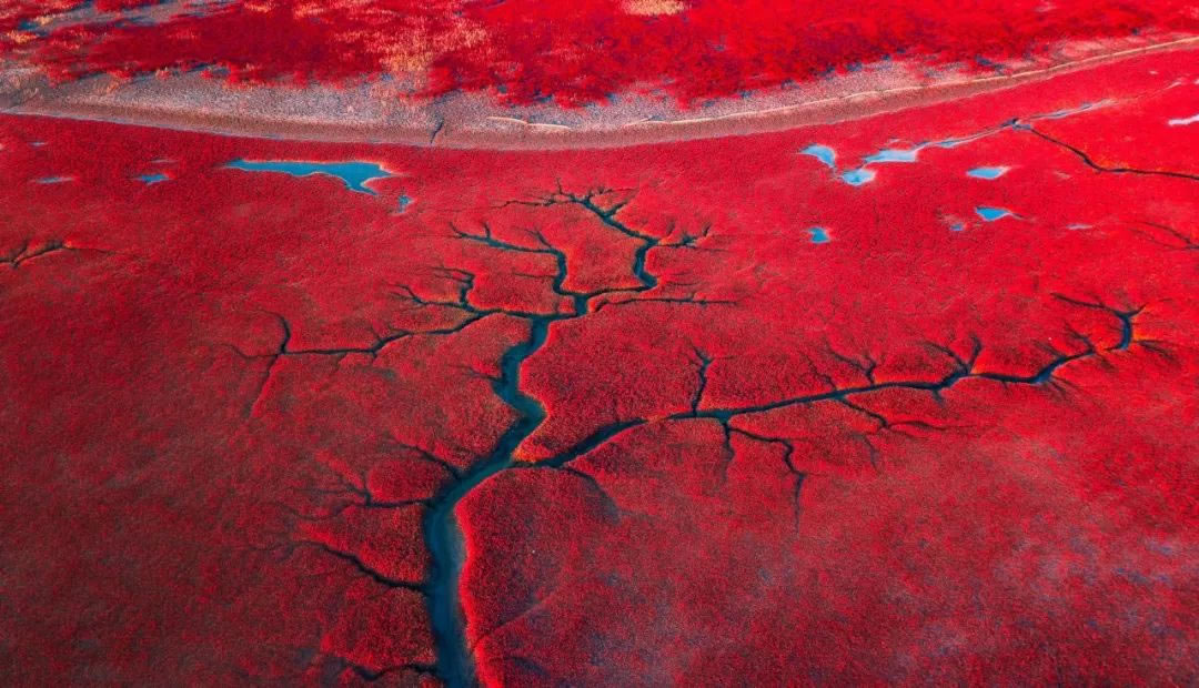 黃河口、遼河口濕地秋天里會(huì)鋪上一望無(wú)際的“紅地毯”,這種名叫“鹽地堿蓬”的鹽生植物,因分布面積廣又有著火紅顏色,竟然在不知不覺間染“紅”了近半個(gè)中國(guó),形成了壯美的紅色景觀。鋪天蓋地般蓬勃出濃烈的色彩和生命張力。這是草木生命的綻放,于空闊的無(wú)人之境,自然呈現(xiàn)。