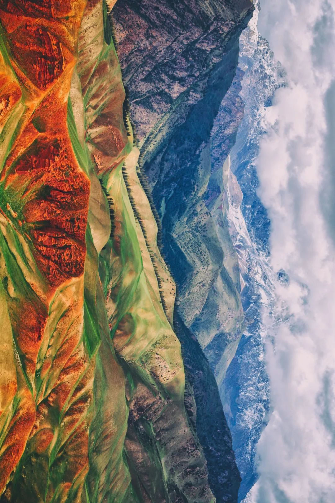 在西北干旱區(qū),從新疆、甘肅的戈壁綠洲到寧夏、陜北的黃土高原,億萬(wàn)年以來(lái)沉積環(huán)境的變化造就了地層中不同化學(xué)元素的積累,顯現(xiàn)出深淺不一的色帶,地殼的構(gòu)造運(yùn)動(dòng)使得原本水平的地層發(fā)生不同角度的傾斜和抬升,流水的切割和風(fēng)沙的吹蝕,將這些延綿不絕的彩色條帶暴露于地表,并斑駁成多種多樣的形態(tài)。