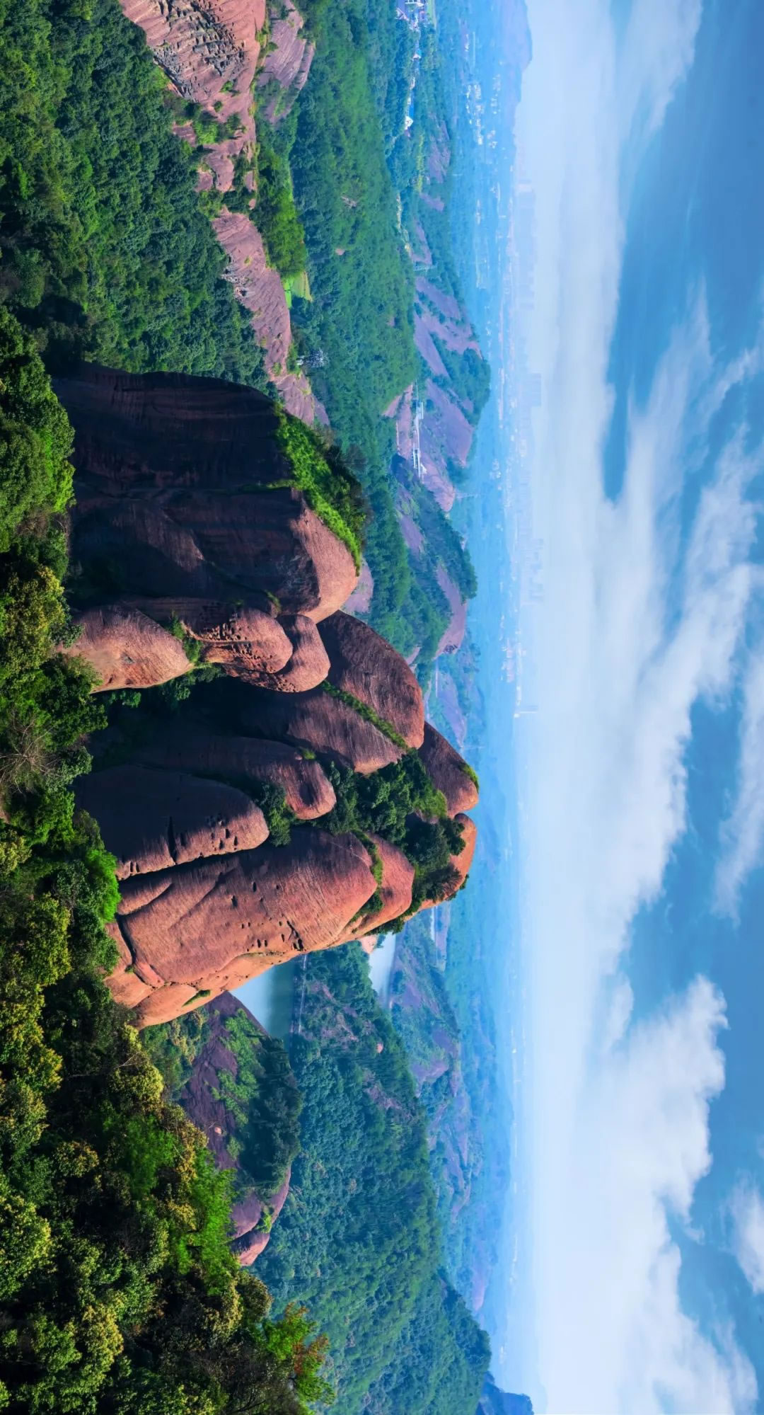 南方丹霞地貌區(qū)向來(lái)與人類的居住地雜糅在一起,峭壁之下就是村莊和田地,孤絕的地勢(shì)往往又被避難的人們視作天塹、被虔誠(chéng)的信徒奉為神佛居所。丹霞山、龍虎山、艮山、武夷山等紅色丹霞峰巒浮動(dòng)于云霧之間,如鯨魚、如海豚般起伏多變。