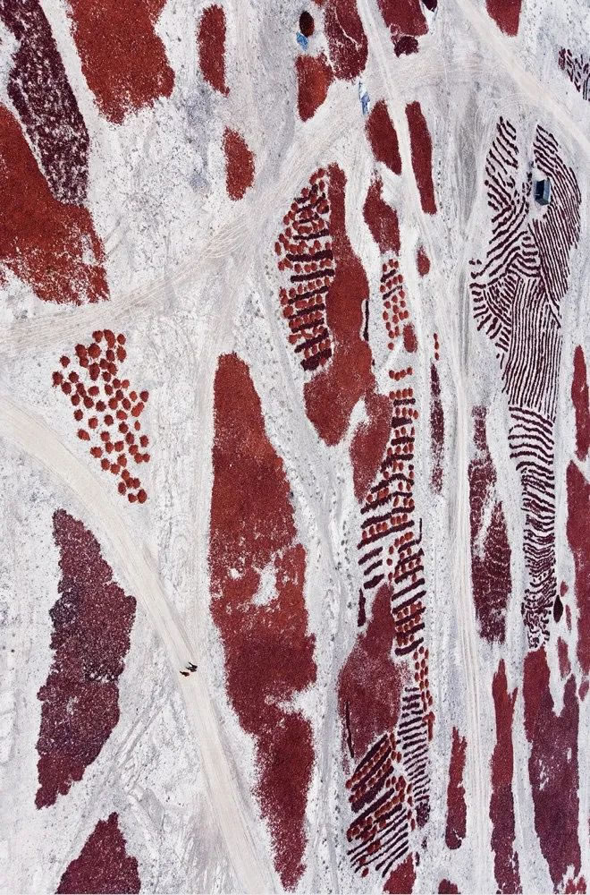 你看,農(nóng)民們辛勞一年,在他們眼中,果園里紅彤彤的蘋果、深紅的大棗是秋天里可愛的笑臉,寧夏的枸杞也紅了,晾曬時(shí)鋪滿大地,斑斕可愛。鋪滿地面的,更有新疆的辣椒,顏色本就極紅,單獨(dú)一顆已是十分鮮艷奪目,現(xiàn)在不計(jì)其數(shù)的辣椒平攤在戈壁曠野之上,鋪天蓋地連成一片,仿若熊熊烈火燎原,幾乎燒到了天邊。