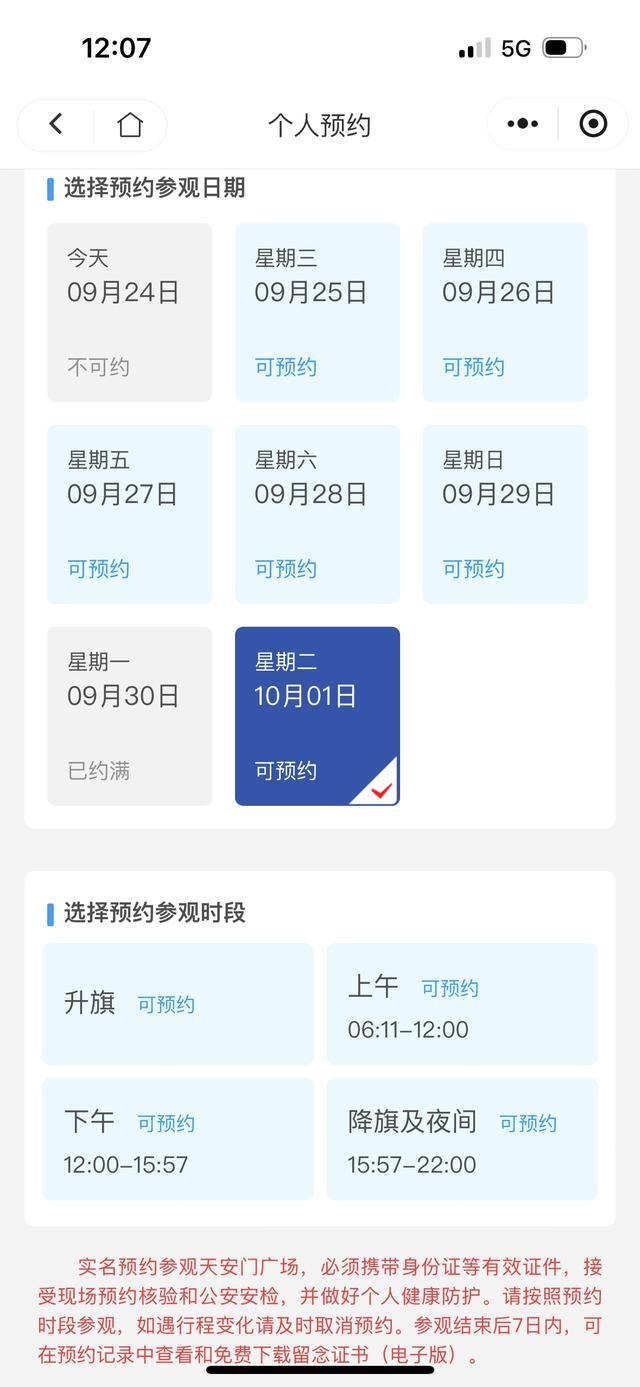 9月24日中午12時,10月1日“升旗”時段的預(yù)約對外開放。不到半小時,國慶節(jié)當(dāng)天“升旗”已經(jīng)全部約滿。