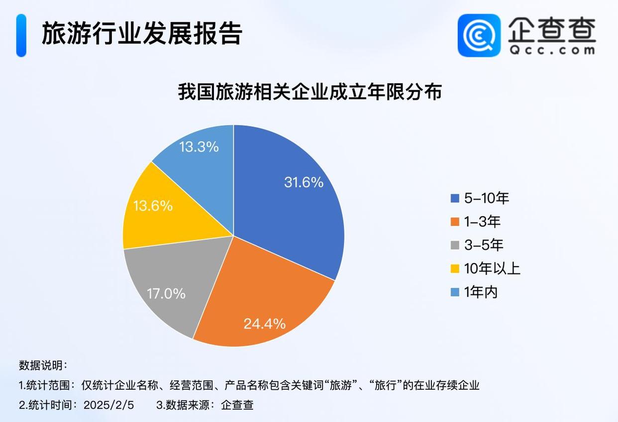 企查查數(shù)據(jù)顯示,我國現(xiàn)存220.4萬家旅游相關(guān)企業(yè)。成立年限上,我國成立5-10年的旅游相關(guān)企業(yè)最多,占比31.6%,其次是成立1-3年的企業(yè),占比24.4%,成立1年內(nèi)的企業(yè)數(shù)量最少,占比13.3%。