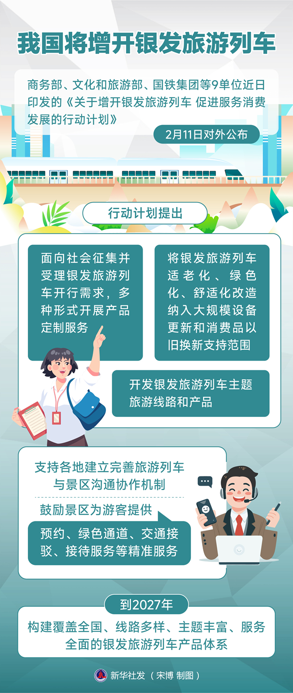 商務(wù)部、文化和旅游部、國鐵集團(tuán)等9單位近日印發(fā)的《關(guān)于增開銀發(fā)旅游列車 促進(jìn)服務(wù)消費(fèi)發(fā)展的行動計劃》11日對外公布,從增加銀發(fā)旅游列車服務(wù)供給、強(qiáng)化適老化設(shè)施保障、提升銀發(fā)旅游列車服務(wù)水平、優(yōu)化銀發(fā)旅游列車發(fā)展環(huán)境等方面提出12條具體舉措。