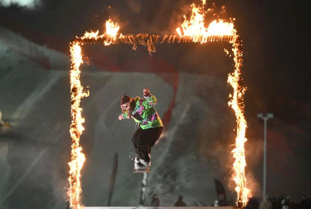 1月29日,雪友在新疆將軍山國(guó)際滑雪度假區(qū)新春趣味滑雪公園跳臺(tái)活動(dòng)上鉆過(guò)火圈。新華社記者胡虎虎 攝