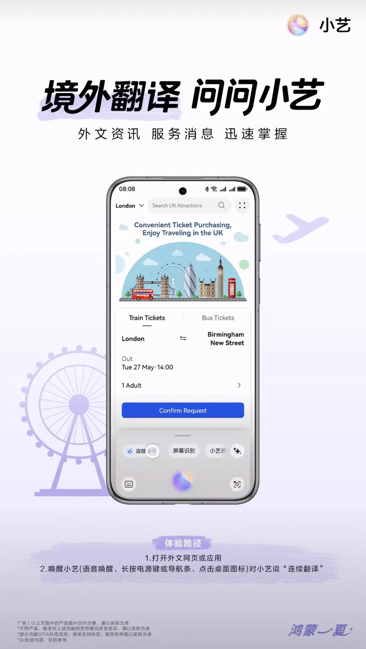 出境游線上點(diǎn)餐、使用本地應(yīng)用或?yàn)g覽網(wǎng)站時(shí),外文語言不通常常成為攔路虎。升級(jí)鴻蒙5的用戶可以用小藝“連續(xù)翻譯”功能解決。長(zhǎng)按小藝導(dǎo)航條,點(diǎn)擊“連續(xù)翻譯”服務(wù)即可體驗(yàn),一次開啟就能實(shí)現(xiàn)屏內(nèi)邊瀏覽邊翻譯的系統(tǒng)級(jí)連續(xù)翻譯體驗(yàn),支持截屏、文檔、瀏覽器等全場(chǎng)景的連續(xù)性翻譯。如果是面對(duì)面點(diǎn)餐、問路等場(chǎng)景,也可以跟小藝說“小藝翻譯助手”,該翻譯Agent提供文本翻譯、同聲傳譯、面對(duì)面翻譯功能,讓出境游無障礙溝通。