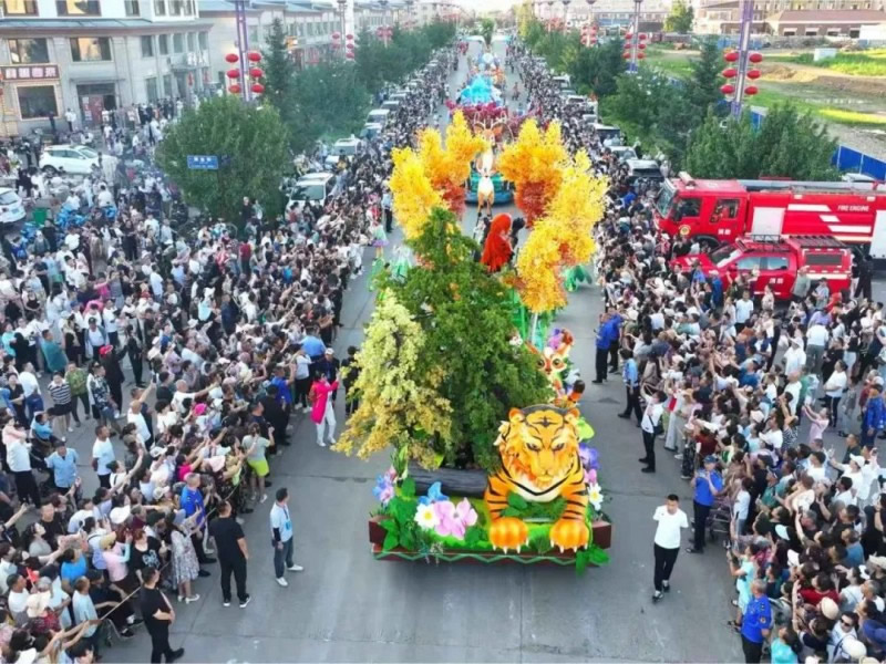 巡游隊(duì)伍中,47名專業(yè)演員的表演同樣精彩紛呈。“金翎飛霄”方陣的男演員們身著女真武士鎧甲,手持長(zhǎng)矛跳起剛勁有力的戰(zhàn)舞;“鐘林毓秀”方陣的女演員則化身森林精靈,輕盈的舞步配合著花車上搖曳的藍(lán)莓枝椏,演繹出林間仙境的唯美畫面。演員們還不時(shí)走下花車與觀眾互動(dòng),教小朋友模仿鄂倫春族的傳統(tǒng)舞蹈動(dòng)作,現(xiàn)場(chǎng)笑聲不斷。