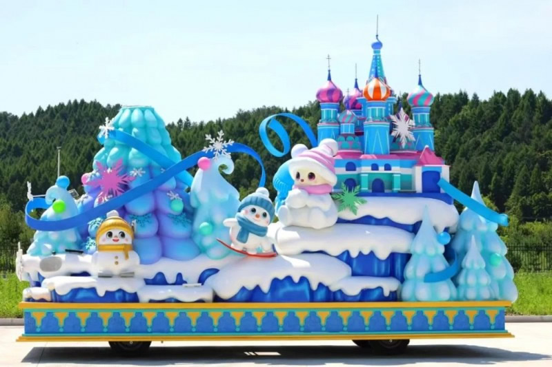花車設(shè)計(jì)不僅注重視覺沖擊力,更融入動(dòng)態(tài)特效:虎頭擺動(dòng)、翅膀扇動(dòng)、雪花機(jī)噴灑等細(xì)節(jié),讓靜態(tài)的造型煥發(fā)生命力。夜幕降臨時(shí),花車更以夜光效果點(diǎn)亮林海,為觀眾呈現(xiàn)一場(chǎng)光影交織的奇幻盛宴。