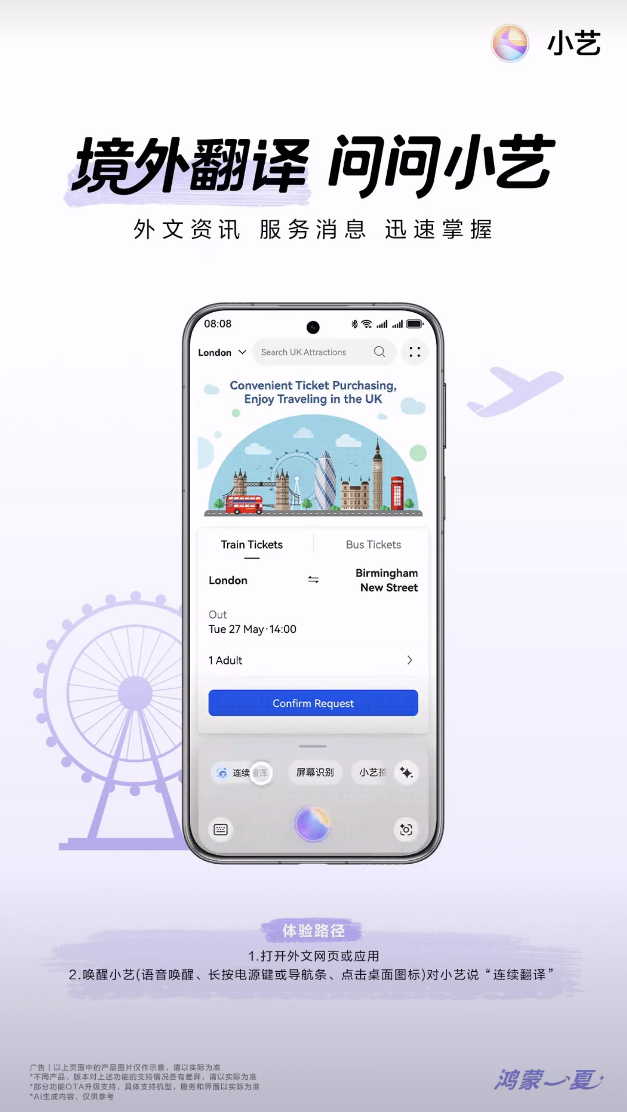 境外游時,難免遇到瀏覽當?shù)鼐W站訂票、打車時卻發(fā)現(xiàn)根本看不懂的麻煩。升級到鴻蒙 5.1的用戶這時就可以用小藝“連續(xù)翻譯”功能解決。長按小藝導航條,點擊“連續(xù)翻譯”服務即可體驗,一次開啟就能實現(xiàn)屏內邊瀏覽邊翻譯的系統(tǒng)級連續(xù)翻譯體驗,支持截屏、文檔、瀏覽器等全場景的連續(xù)性翻譯。