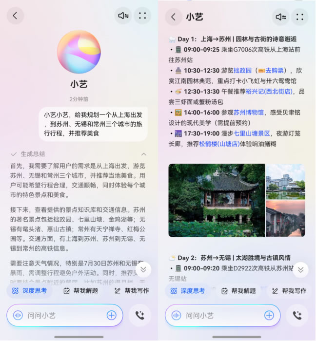 對于多城聯(lián)游來說,行程規(guī)劃十分復(fù)雜。在鴻蒙5的加持下,擁有全新大腦的對話思考式小藝變得“更聰明”,能理解用戶需求并給出針對性的回答。用戶只需對小藝說出需求,例如:“小藝小藝,給我規(guī)劃一個(gè)蘇錫常園林和美食主題三日游。”小藝便能迅速生成一份詳盡的圖文攻略,將蘇州的古典園林、無錫的太湖風(fēng)光,以及常州獨(dú)具特色的中華恐龍園都囊括其中,給出路線、交通、美食等建議。旅途中遇到感興趣的建筑或是不認(rèn)識的植物,也可以隨時(shí)拍照后拖給小藝或圈選屏幕問問小藝,即時(shí)獲得百科解答,讓旅途充滿探索的樂趣。