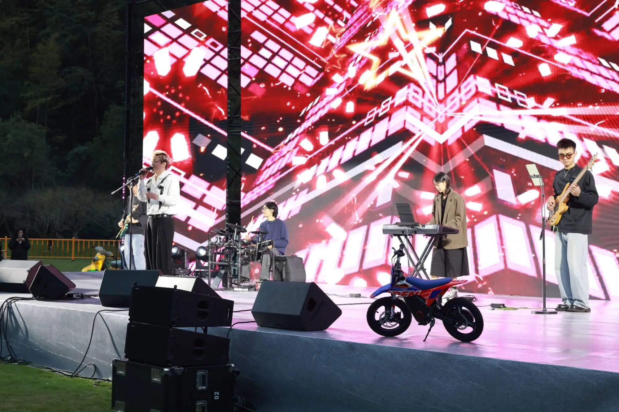 隨著機(jī)車隊(duì)伍陸續(xù)抵達(dá),十九峰大草坪迅速化身為音樂狂歡的海洋。從午后到夜晚,舞臺(tái)持續(xù)高能輸出。搖滾樂隊(duì)點(diǎn)燃全場熱情,流行金曲引發(fā)集體合唱。
