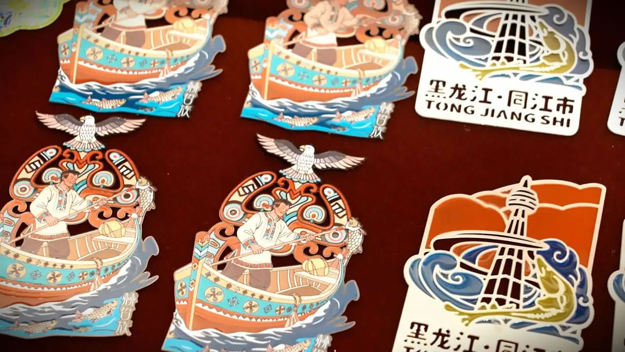 除了魚(yú)皮手工藝品,印著同江特色風(fēng)景的冰箱貼、書(shū)簽、水杯等文創(chuàng)產(chǎn)品也成了游客們的心頭好,在各大景區(qū)的文創(chuàng)商店里時(shí)常被搶購(gòu)一空。