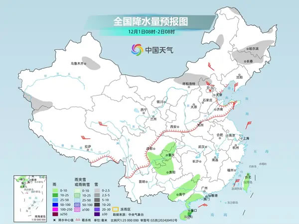 具體來看,中央氣象臺預計,今天,內蒙古中部、黑龍江南部、吉林、新疆沿天山地區(qū)、河北北部等地部分地區(qū)有小雪或雨夾雪。湖南西南部、西南地區(qū)東部、廣西中東部、廣東西南部、海南島、臺灣島等地部分地區(qū)有小到中雨,其中,海南島東南部等地部分地區(qū)有大雨。