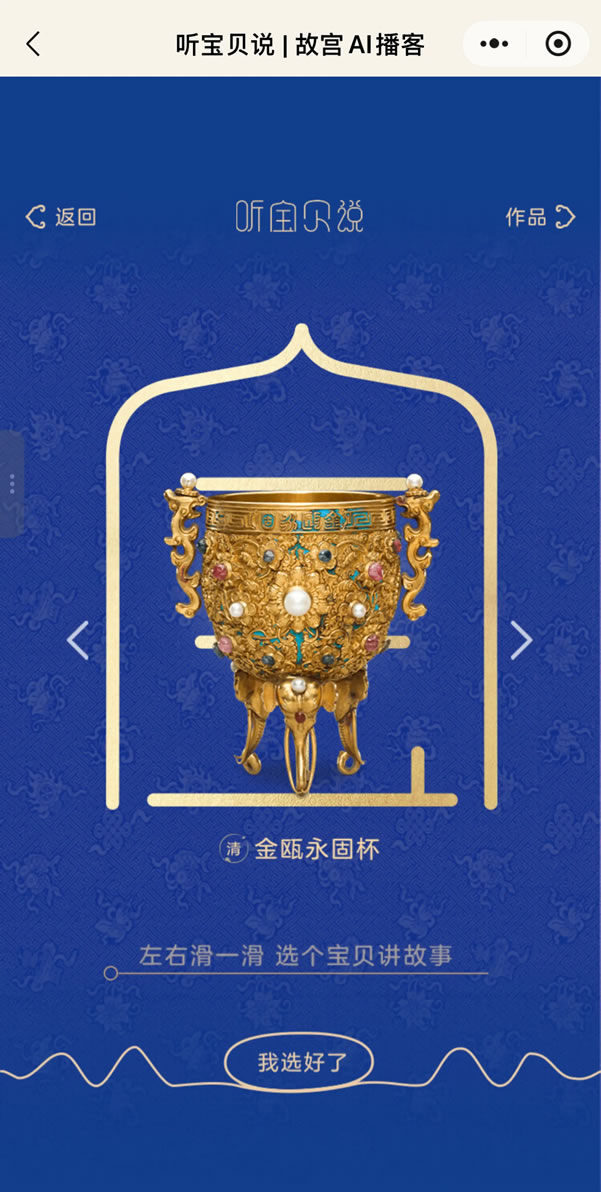 在故宮博物院建院100周年的尾聲,“聽寶貝說”為家長和孩子們呈上一份聲音禮物,通過個性化生成的AI播客,將文物故事轉(zhuǎn)化為視聽語言。那些來自千百年前的珍貴文物,仿佛穿越時空,來到孩子身邊,開始一場“寶貝”與“寶貝”間的聲音互動。部分文物來自故宮博物院常設展館,聽完還可以線下打卡,近距離欣賞文物“寶貝”。