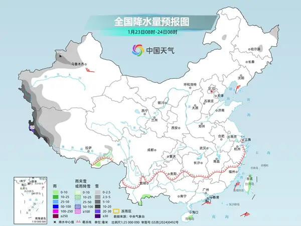 中央氣象臺預(yù)計,今天,新疆南疆西部山區(qū)、西藏西部等地部分地區(qū)有小到中雪,其中,新疆南疆西部山區(qū)部分地區(qū)有大到暴雪。湖南南部、廣西西北部等地局地有凍雨。云南東南部、廣西中東部、福建中部、臺灣島中東部等地部分地區(qū)有小雨,其中,臺灣島東部局地有中雨。
