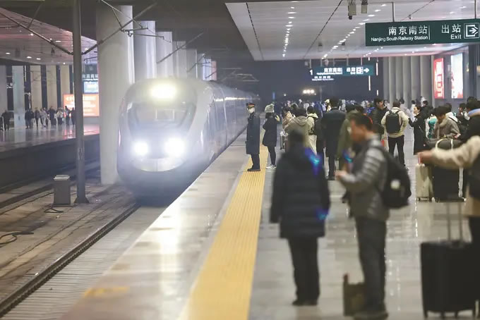 從1月26日零時起,全國鐵路實行新的列車運行圖,調圖后,圖定旅客列車較原圖增加243列。京滬高鐵標桿列車G25次迎來了“瘦身”升級:這趟京滬間最快高鐵取消原有5個?空,僅設南京南站唯一經(jīng)停點。圖為當日晚,旅客在南京南站準備乘坐G25次列車。(陳儼 攝)