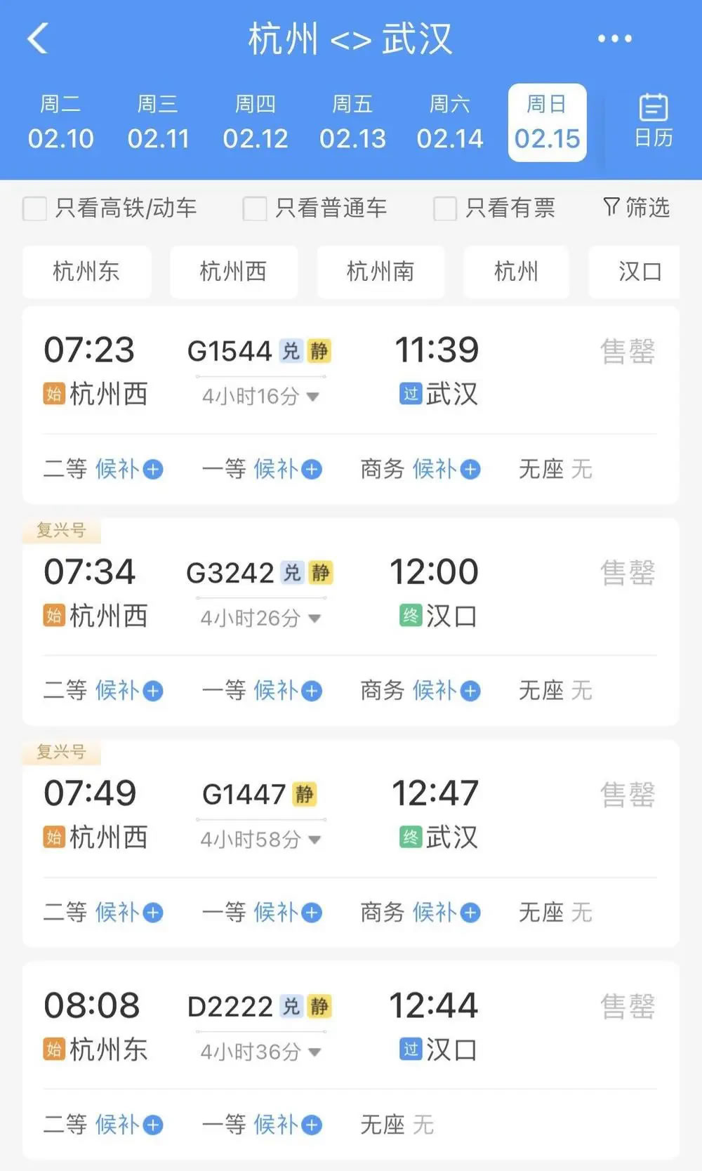比如,2月15日杭州前往武漢、長(zhǎng)沙、南昌、貴陽等地,無論是普速列車還是動(dòng)車組列車,當(dāng)天所有車次已經(jīng)基本全部售罄,只剩極個(gè)別車次硬座、無座席位還有余票。