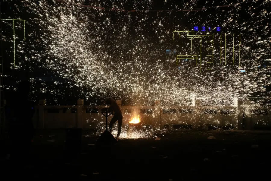 夜幕降臨,非遺打鐵花表演率先登場(chǎng)。匠人們將滾燙的鐵水奮力擊打,萬千金花在夜空綻放,形成“火樹銀花不夜天”的壯觀景象。這門千年技藝承載著人們對(duì)風(fēng)調(diào)雨順、國(guó)泰民安的美好祈愿。