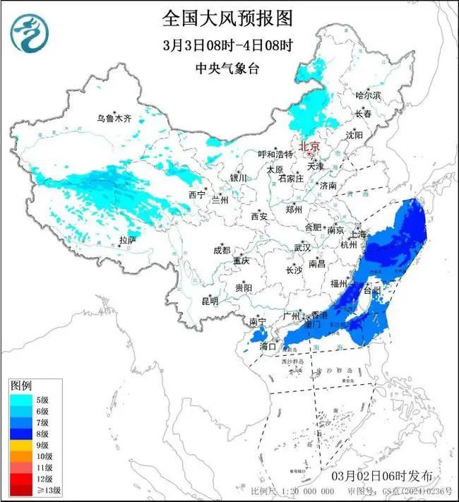 預計,3月2日08時至3日08時,新疆東部、西藏中西部、青海北部、內(nèi)蒙古大部、江蘇東部等地將有5~6級、陣風7~8級的大風;黃海中部和南部海域、東海大部海域、臺灣海峽、臺灣以東洋面、南海東北部偏北海域?qū)⒂?~8級、陣風9級的大風,其中黃海東南部海域、東海北部海域風力可達9~10級、陣風11級。