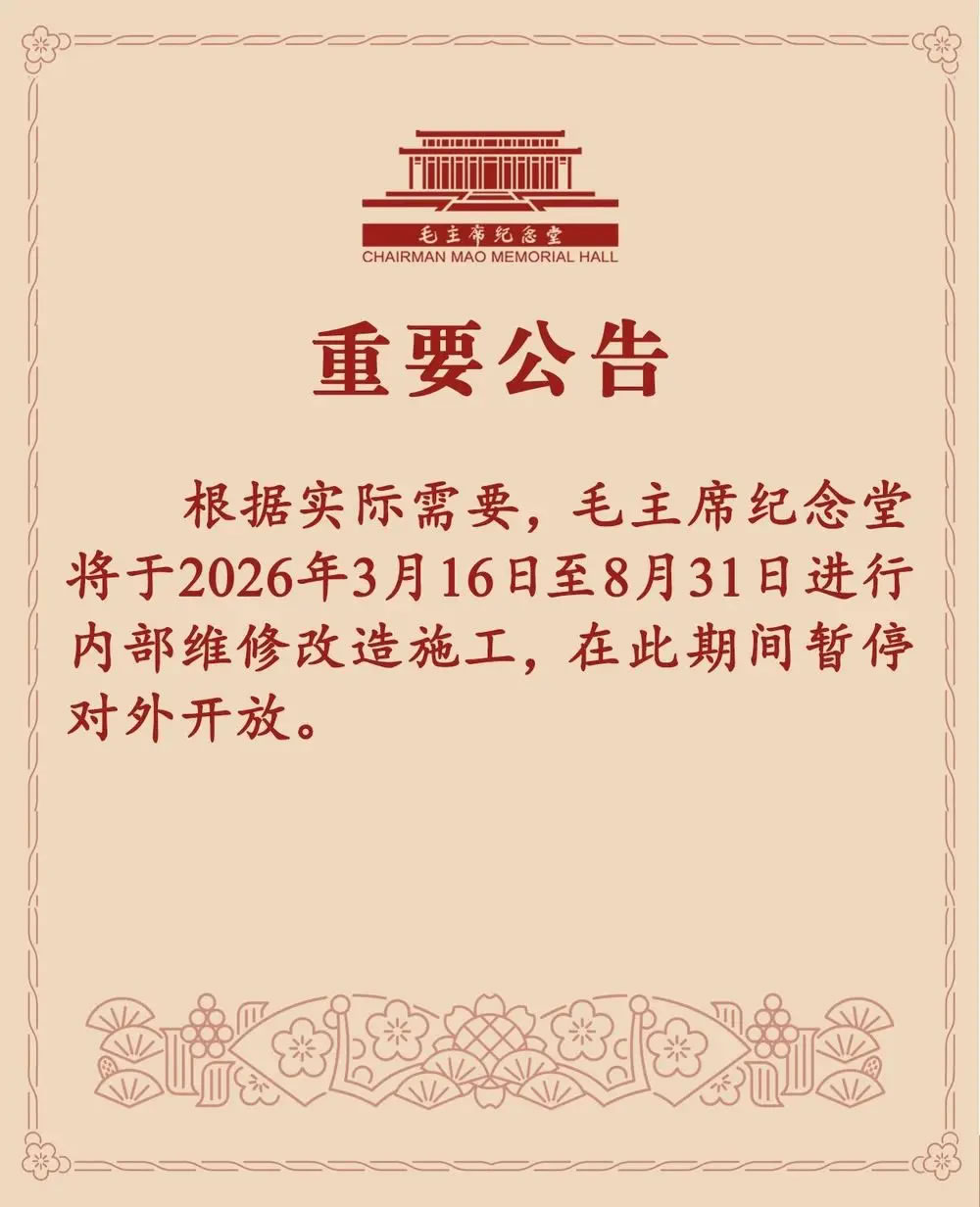 3月13日,毛主席紀念堂發(fā)布公告,3月16日至8月31日內(nèi)部維修改造施工,期間暫停對外開放。