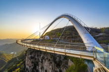 玻璃橋?yàn)闊o背索斜拉弧形玻璃橋,建于潭溪山海拔700米的崖壁之上,橋面跨度117米,懸空高度101米,外弧最大半徑90米,總承載可達(dá)900噸,單次承載10000人。玻璃橋整體由百米觀光電梯、懸崖酒店及玻璃橋體組成。其中,百米觀光電梯采用全景玻璃設(shè)計(jì),依懸崖而建,集觀光、代步、游覽為一體。橋體的彩虹狀獨(dú)特造型,充滿動(dòng)感與美感,且與山崖風(fēng)格渾然一體。潭溪山高空玻璃橋迄今為止,潭溪山高空玻璃橋已獲得兩項(xiàng)國際大獎(jiǎng):2019年世界結(jié)構(gòu)大獎(jiǎng)——行人橋梁獎(jiǎng),2020年國際橋梁大會(huì)(IBC)——亞瑟·海頓獎(jiǎng)。