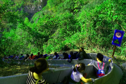 滑道自高門洞起,至空中玻璃漂流入口處止,長約千米。此處山坡陡斜,樹木茂密,滑道從樹叢中順山勢(shì)蜿蜒而下,看似蟒行山間草叢中。其中有八個(gè)急彎,落差較大,乘坐滑道飛速從山頂滑至山腰,驚險(xiǎn)刺激,樂趣無窮。