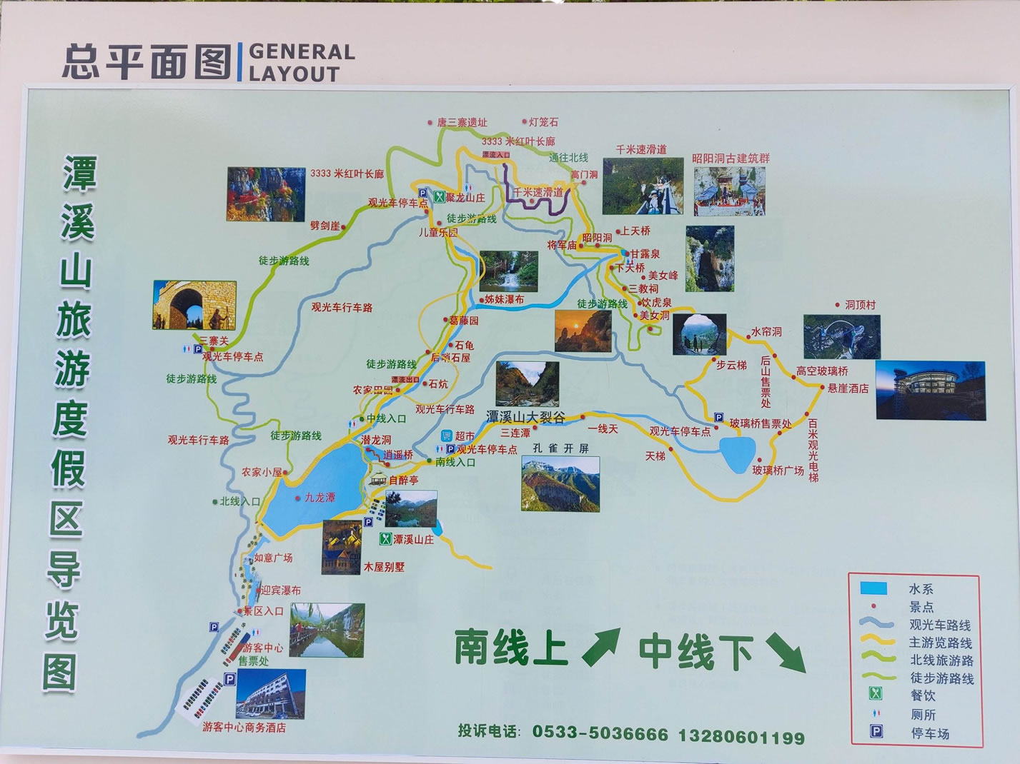 旅游南線:全程約3小時(shí),以山水景觀、奇石怪峽和豐富的人文景觀為特色,主要景點(diǎn)有: 潭溪山大瀑布、如意廣場、九龍?zhí)、自醉亭、潛龍洞、逍遙橋、石臼、石壩、滄桑石屋、孔雀開屏、潭溪山大裂谷、三連潭、太子石像、一線天、較量、兄弟瀑布、石祖(生命之根)、步云梯、王小洞、百米觀光電梯、高空玻璃橋、洞頂村、星洞傳說、水簾洞、龍鳳臺(tái)、美女峰、美女洞、九龍擁翠、飲虎泉、三教祠(昭陽南洞)、仙人橋(下天橋)、甘露泉、通天洞(生命之源)、上天橋、昭陽洞(昭陽洞北洞)、將軍祠、試劍峰、高門洞、千米速滑道、空中玻璃漂流、兒童樂園,乘坐觀光車或沿旅游中線步行下山。