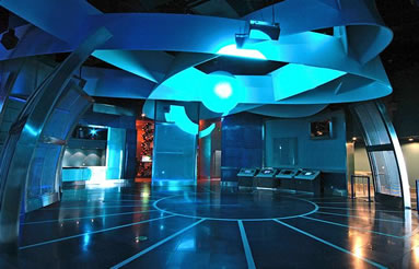 太空影院是中國第一家采用視頻拼接、圖像處理、觀眾互動、電腦集成等技術(shù)綜合而成的多媒體球幕影院。Digistar3系統(tǒng)共有6臺視頻投影儀,照明功率達到了4800瓦。它們在計算機的控制下,在直徑13米的球形銀幕透射出6幅銜接的影像,組成一幅完整的全球幕影象。整個影院有69個座位,座位的傾斜度達到了23度,觀眾幾乎是躺著看電影的。最新奇的是每個座位的扶手上有一個控制按鈕,觀眾可以按此按鈕控制電影劇情的發(fā)展,達到了“畫隨人動,人隨畫思”的境界。