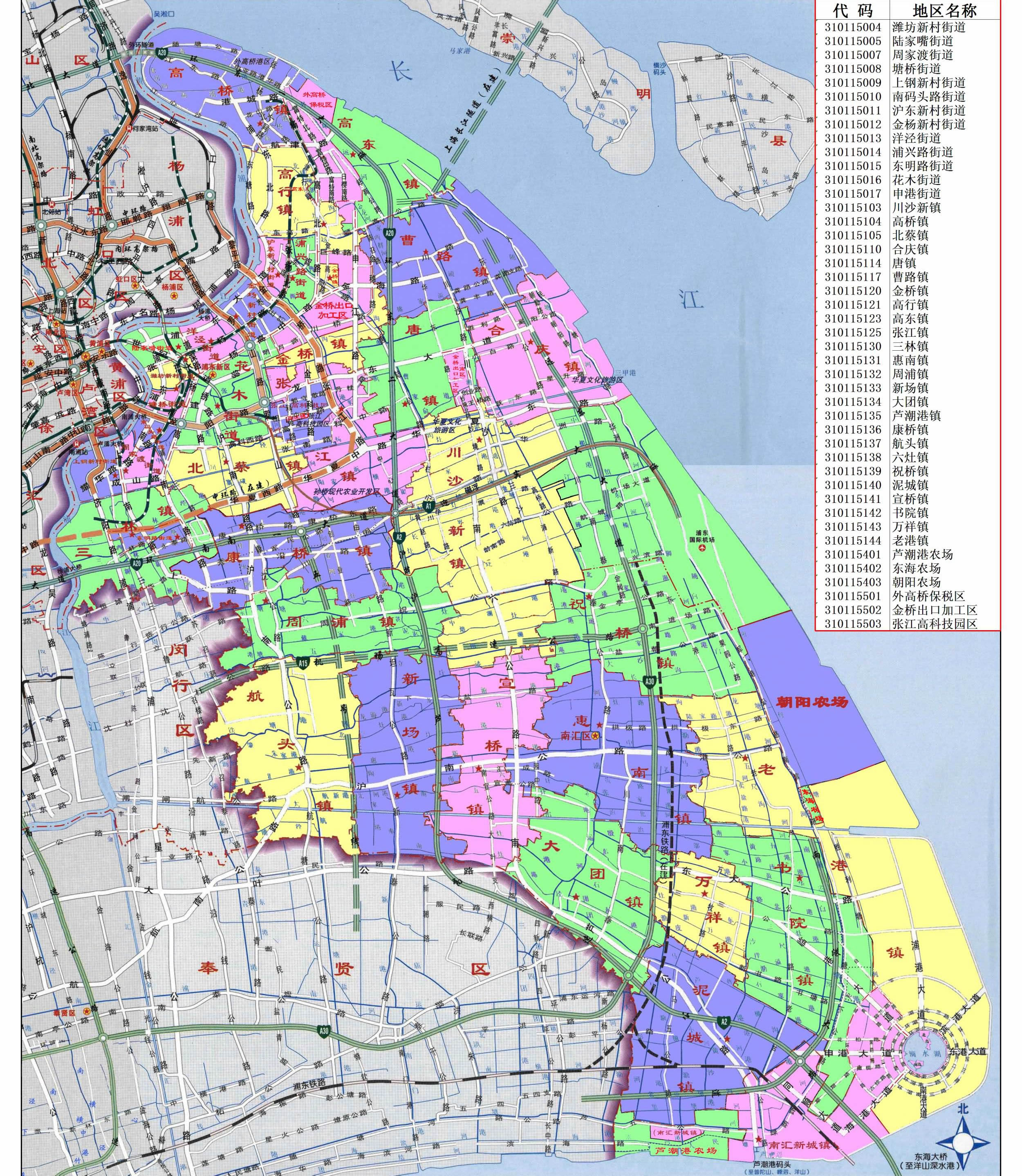 鎮(zhèn):川沙新鎮(zhèn)、高橋鎮(zhèn)、北蔡鎮(zhèn)、合慶鎮(zhèn)、唐鎮(zhèn)、曹路鎮(zhèn)、金橋鎮(zhèn)、高行鎮(zhèn)、高東鎮(zhèn)、張江鎮(zhèn)、三林鎮(zhèn)、惠南鎮(zhèn)、周浦鎮(zhèn)、新場鎮(zhèn)、大團(tuán)鎮(zhèn)、康橋鎮(zhèn)、航頭鎮(zhèn)、祝橋鎮(zhèn)、泥城鎮(zhèn)、宣橋鎮(zhèn)、書院鎮(zhèn)、萬祥鎮(zhèn)、老港鎮(zhèn)、南匯新城鎮(zhèn)