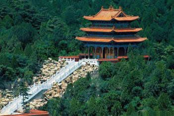 烏金山不僅有豐富的自然景致,而且還有數(shù)不盡的人文景觀。由于烏金山山高林密,氣候宜人,風(fēng)景秀美,靜謐清幽,歷朝歷代多有僧侶入山修行,更有文人墨客、達(dá)官顯貴前來觀瞻,因此便留下了許多人文遺跡。這里是佛教圣地五臺(tái)山的下院,曾被稱為文殊菩薩講經(jīng)的道場(chǎng),于是便形成了以寺廟群落為主的諸多景觀。許多寺廟群都依山而建,金碧輝煌,氣勢(shì)恢弘。這些寺廟群大都分布在千頃碧綠的林海中。遠(yuǎn)遠(yuǎn)望去,就像茫茫綠海中時(shí)隱時(shí)現(xiàn)的海市蜃樓,顯得縹緲奇幻而又雄偉壯觀。