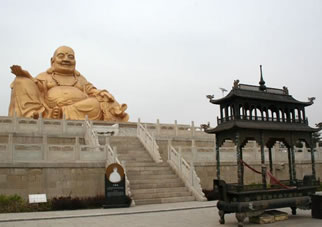 彌勒大佛臺(tái)位于九峰塔以南1000米處的龜背山頂。烏金山彌勒大佛由漢白玉雕琢而成,高9.9 米。彌勒大佛臺(tái)基座為三層,高5米。第三層為須彌座,前面浮雕為二十諸仙圖,西面為十八羅漢,東面為十二圓覺,北面為十大明王,四角為四大金剛。從地面到佛頂共高14.9米。