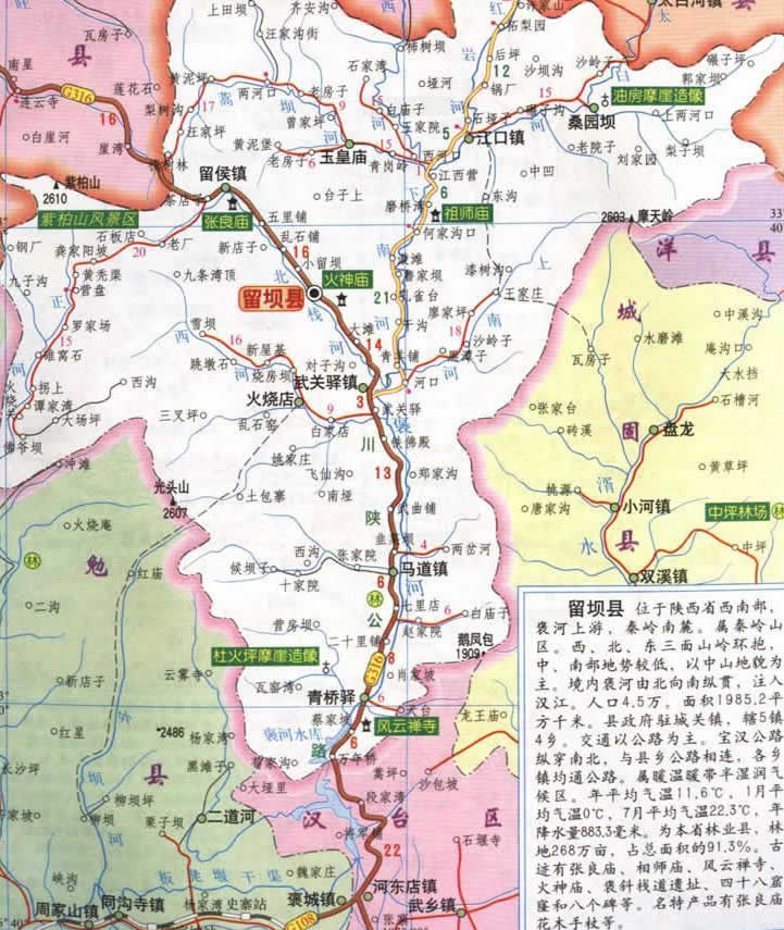 留壩縣地處秦嶺南麓,漢江上游,“面巴蜀而背秦川”,屬亞熱帶濕潤季風(fēng)氣候區(qū),夏無酷暑,冬無嚴(yán)寒,生態(tài)環(huán)境優(yōu)越,地質(zhì)地貌特征獨(dú)具特色,歷史文化積淀豐厚,自然景觀與人文景觀交相輝映,蘊(yùn)藏著極其豐富的旅游資源。