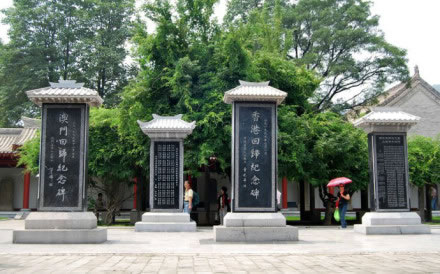 碑亭西前方,矗立著四塊石碑:香港回歸紀(jì)念碑、澳門回歸紀(jì)念碑、“臺(tái)灣光復(fù)致敬團(tuán)”祭黃帝陵文碑、慶祝香港回歸祖國十周年黃陵謁祖祭文碑。