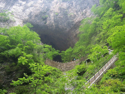 蟒洞是一條又細又窄的峽谷縫隙里的一個洞穴。站在洞中向上望,有一條狹長的縫隙看到天空,就像是雷電劈開的痕跡。洞中有一形似巨蟒的鐘乳石側(cè)臥在洞中,故名蟒洞。