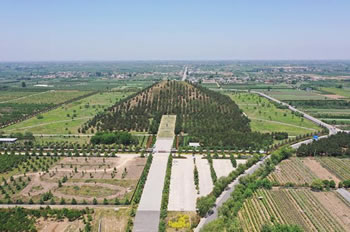 上述與今測(cè)量數(shù)字基本相符?傉嫉孛娣e計(jì)為56878.25平方米,封土體積848592.92立方米。陵園四周呈方形,平頂,上小下大,形如覆斗,顯得莊嚴(yán)穩(wěn)重。